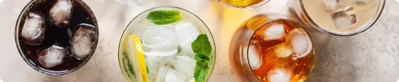 Wir bieten verschiedene Arten von heißen und kalten Getränken, Säfte, Sirupe, eine große Auswahl an Kaffee und Tee, Eiswürfel und Crushed Ice.